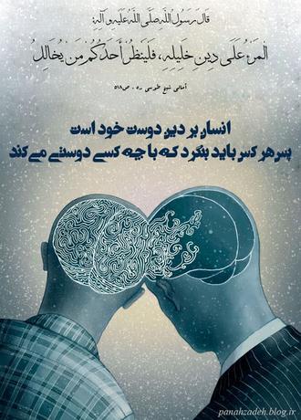 رسول خدا صلی‌الله علیه وآله فرمودند: انسان بر دین دوست خود است؛ پس هرکس باید بنگرد که با چه کسی دوستی می‌کند.