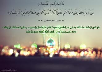 «هُوَ بِمَنْزِلَةِ مَنْ کَانَ مَعَ الْقَائِمِ (علیهالسلام) فِی فُسْطَاطِهِ» [هر کس از شما به اعتقاد به این امر بمیرد در حالى که منتظر آن باشد، مانند کسى است که در خیمه قائم علیه السّلام باشد].