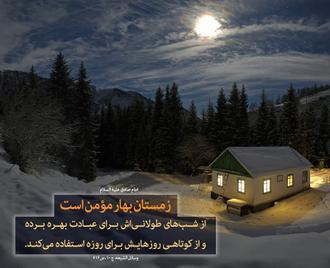 حضرت امام جعفر صادق علیهالسلام فرمودند: «الشِّتَاءُ رَبِیعُ الْمُؤْمِنِ یَطُولُ فِیهِ لَیْلُهُ فَیَسْتَعِینُ بِهِ عَلَى قِیَامِهِ وَ یَقْصُرُ فِیهِ نَهَارُهُ فَیَسْتَعِینُ بِهِ عَلَى صِیَامِهِ» (زمستان، بهار مؤمن است، شبش طولانی بوده و کمکی برای عبادت شبانه است، روزش کوتاه است و کمکی برای روزه گرفتن است).